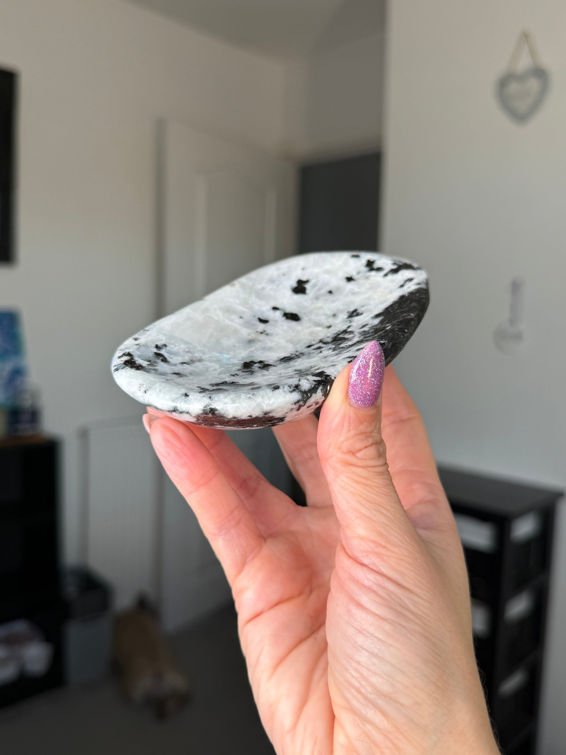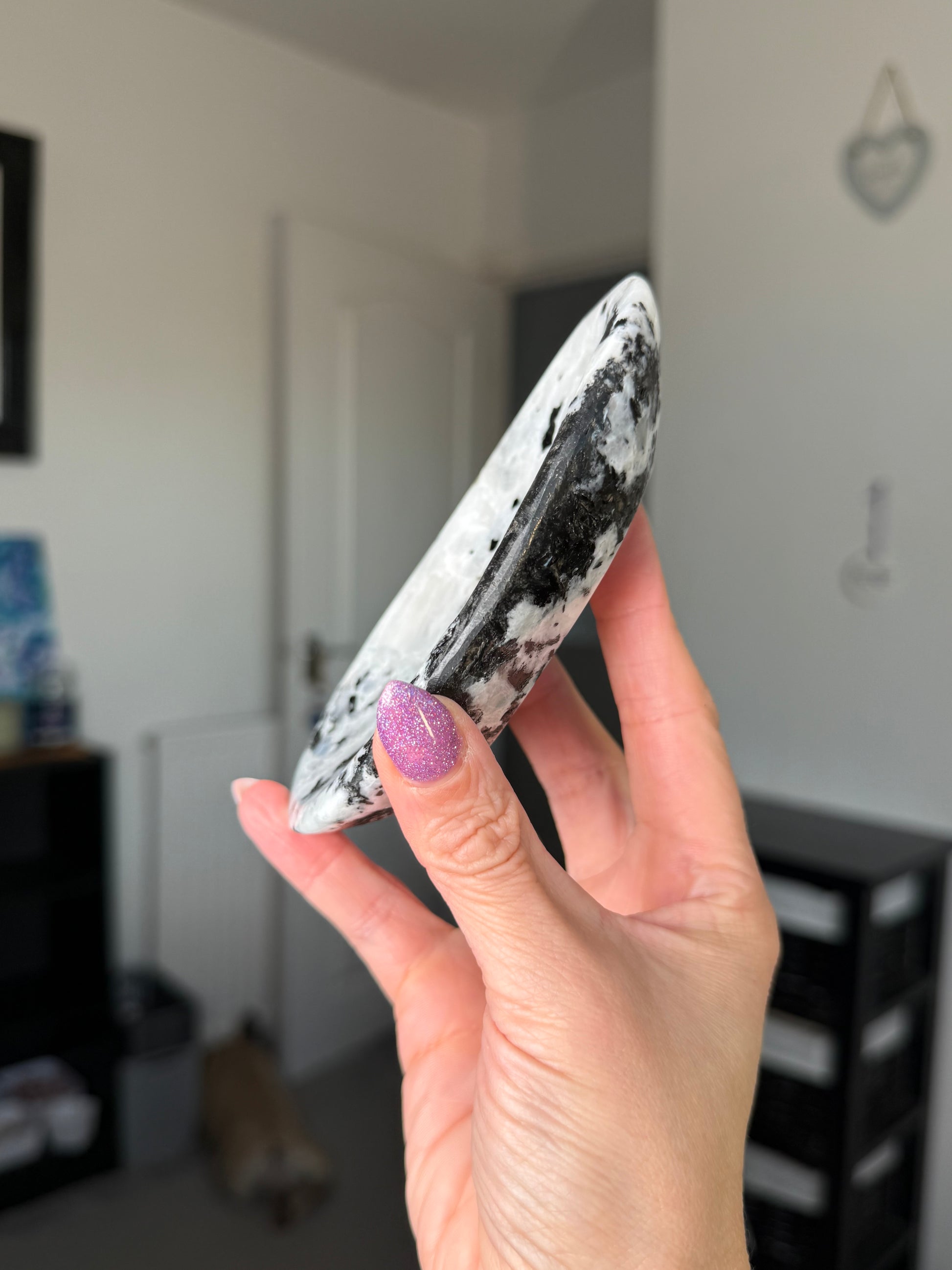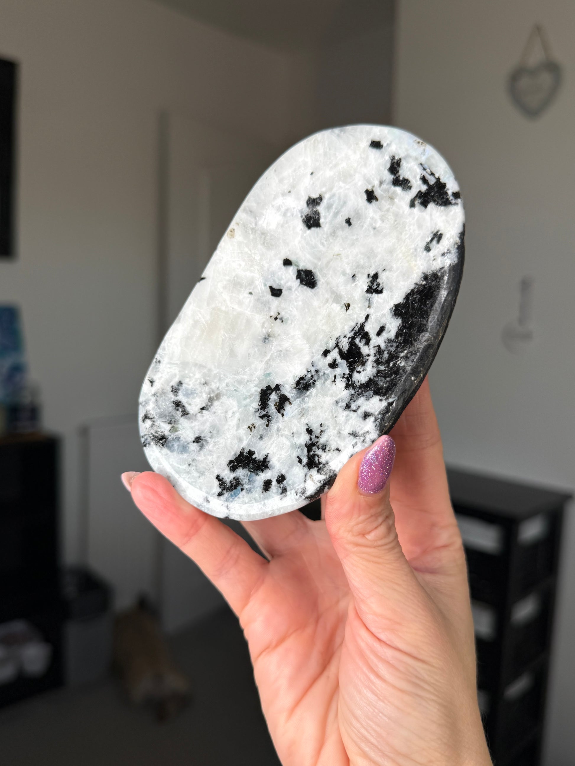 Rainbow moonstone has such a gorgeous energy! Really good to bring harmony and peace and useful to keep in communal areas such as the front room to bring that harmony to others.