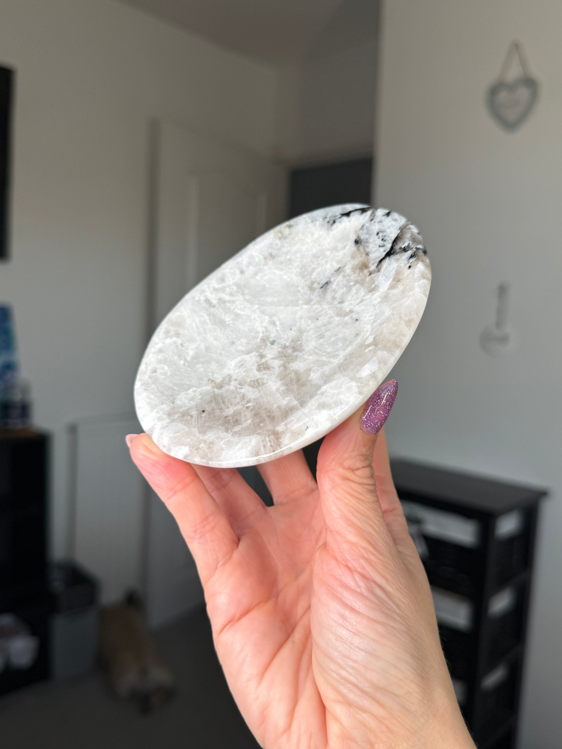 Rainbow moonstone has such a gorgeous energy! Really good to bring harmony and peace and useful to keep in communal areas such as the front room to bring that harmony to others.