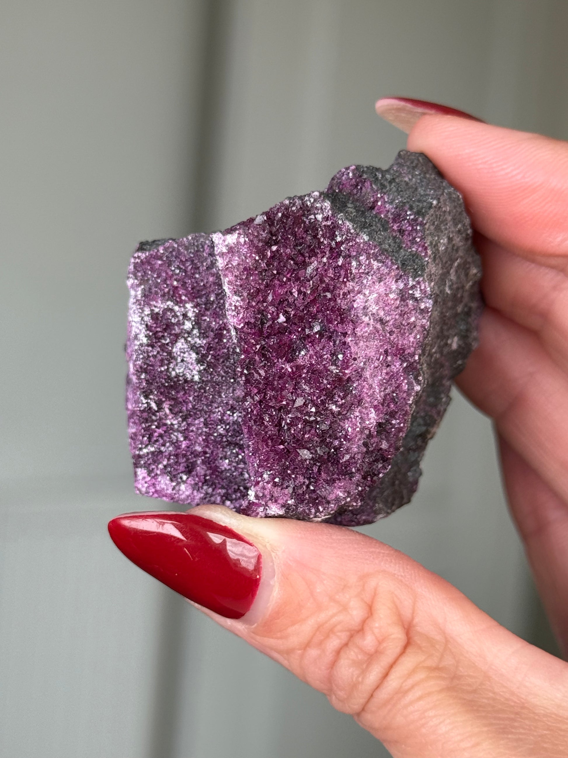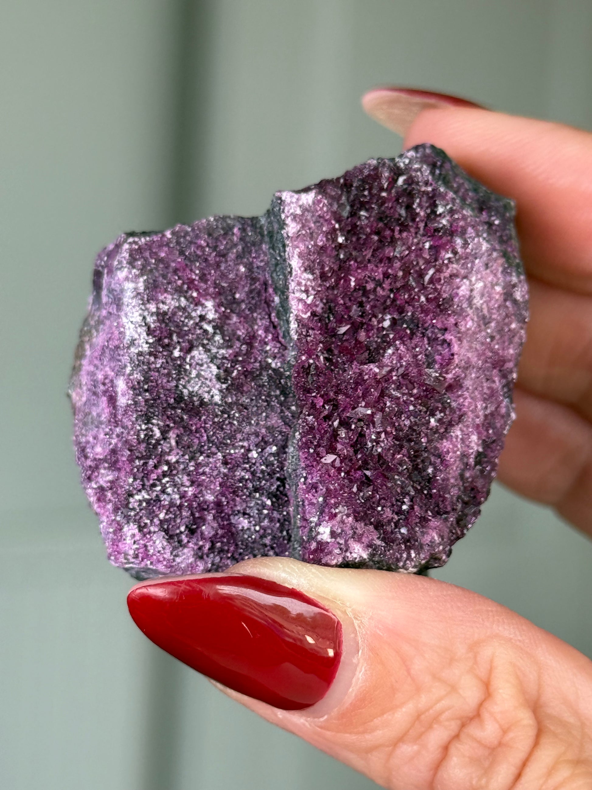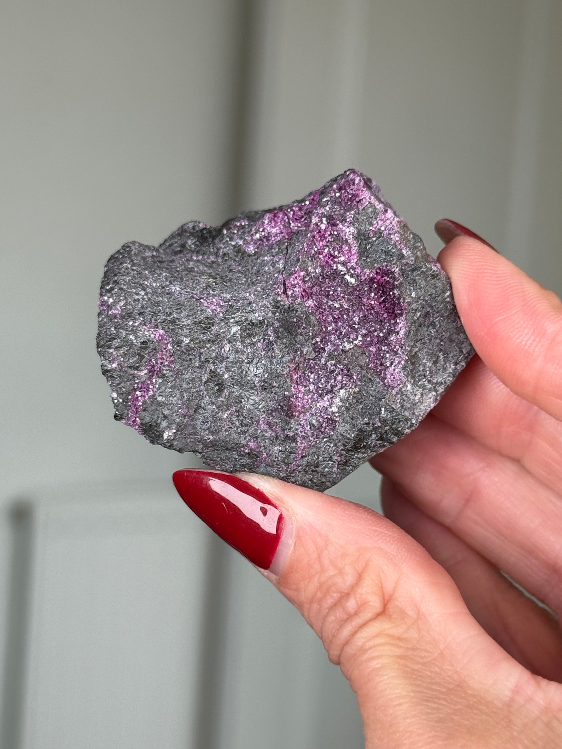 These are very special pieces! Unlike the Kammererite that we usually see from India, this Turkish Kammererite is crystallised and sparkles on the host rock which also happens to be kinda sparkly ✨