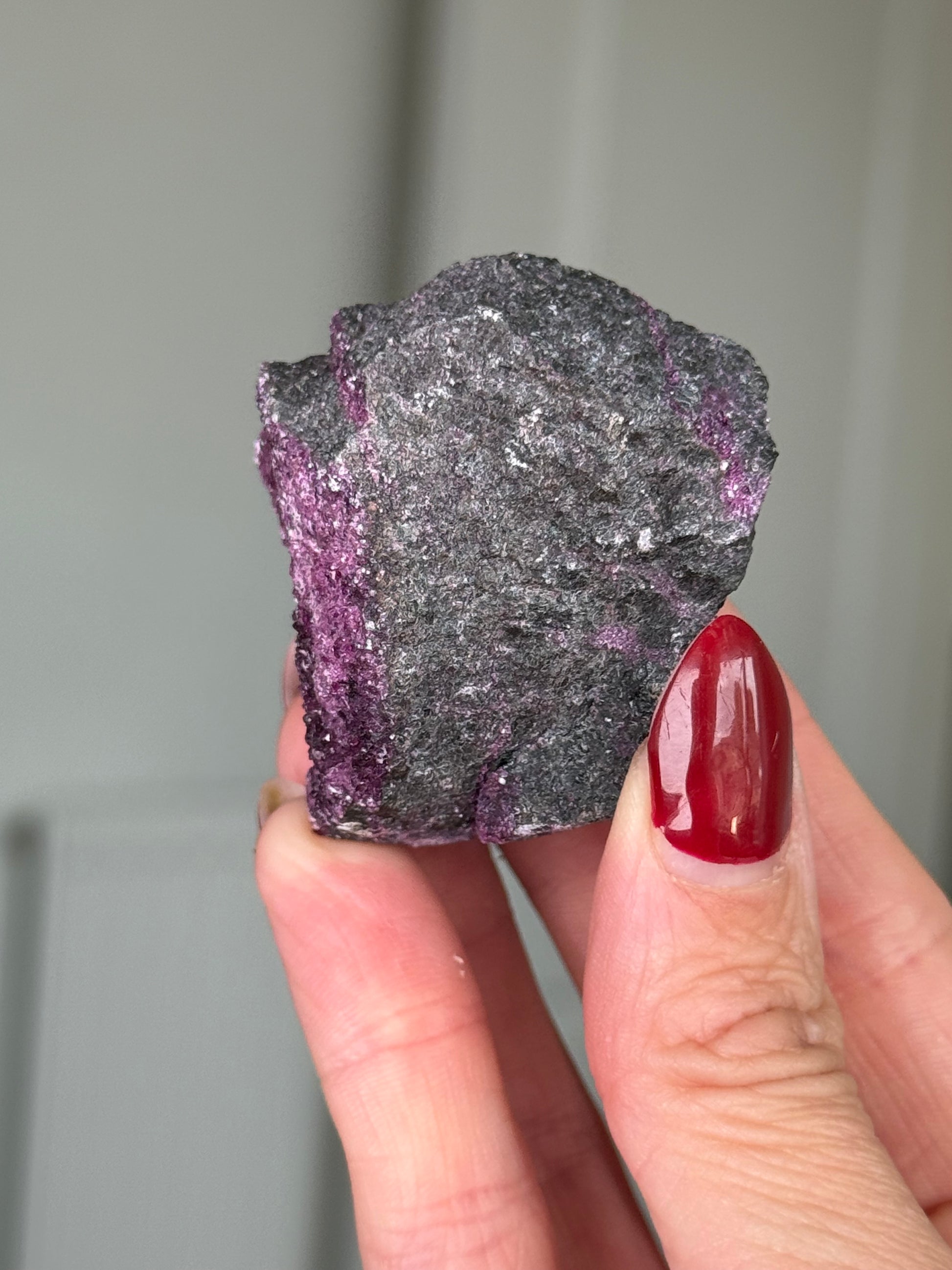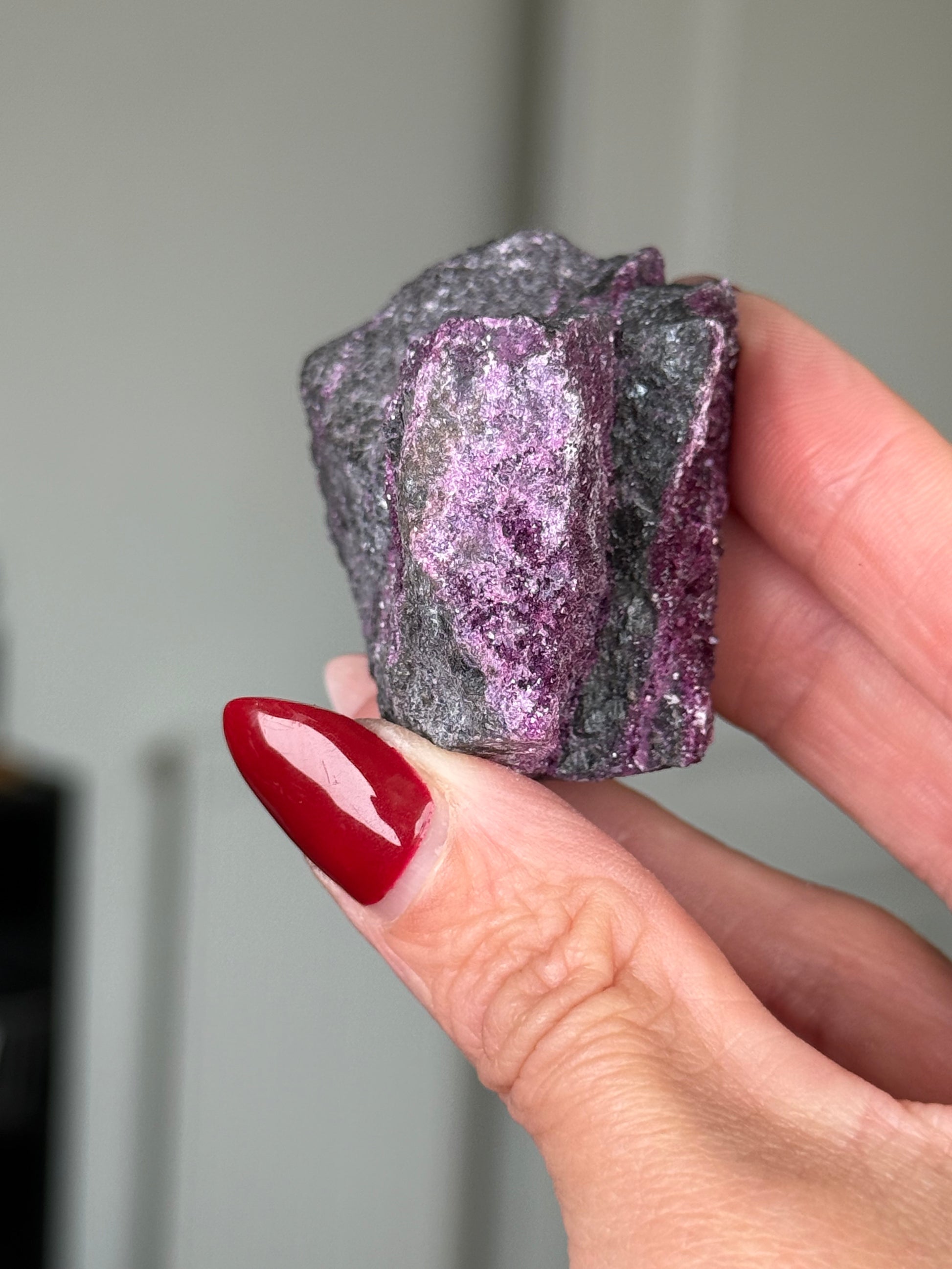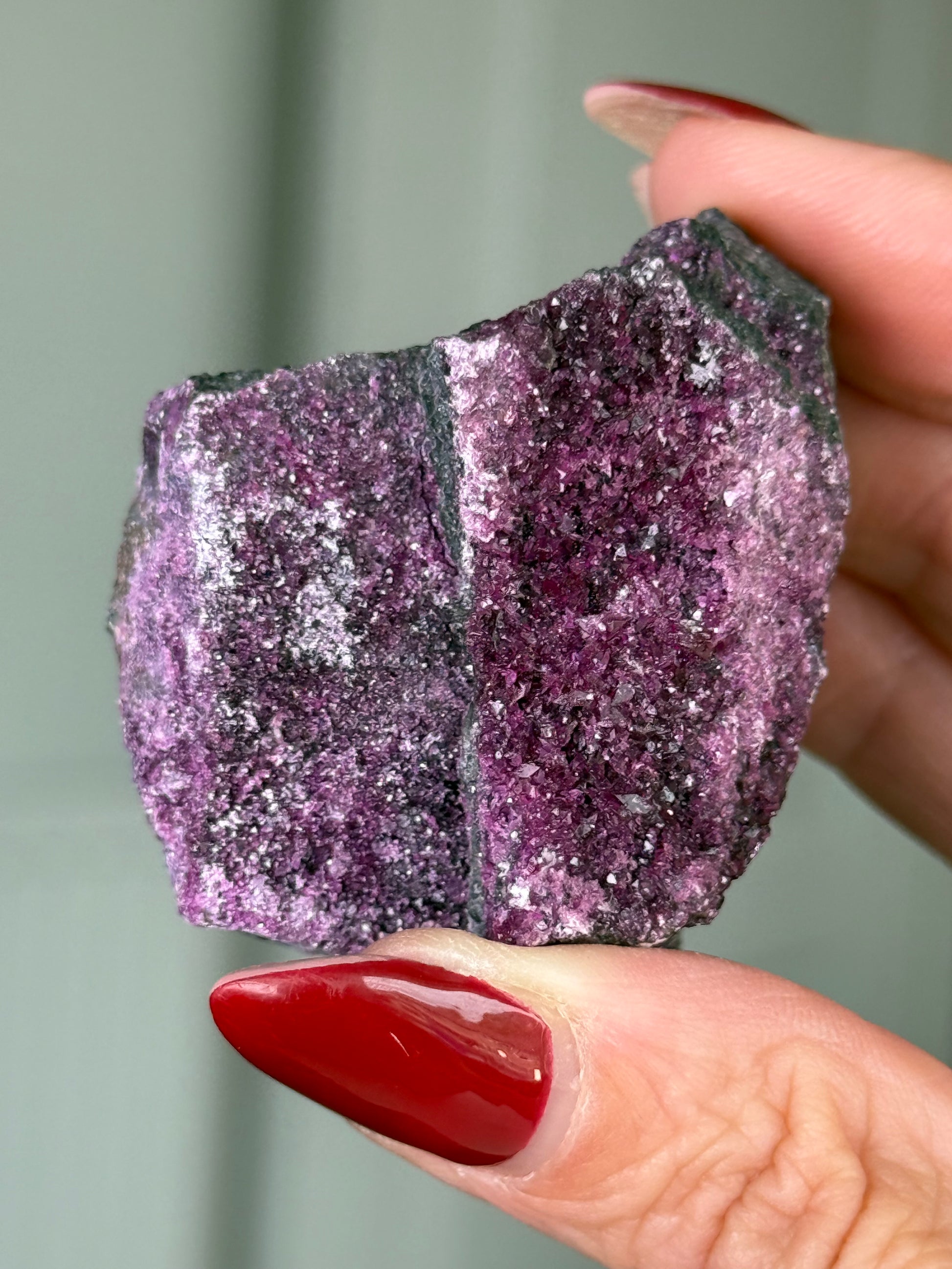These are very special pieces! Unlike the Kammererite that we usually see from India, this Turkish Kammererite is crystallised and sparkles on the host rock which also happens to be kinda sparkly ✨