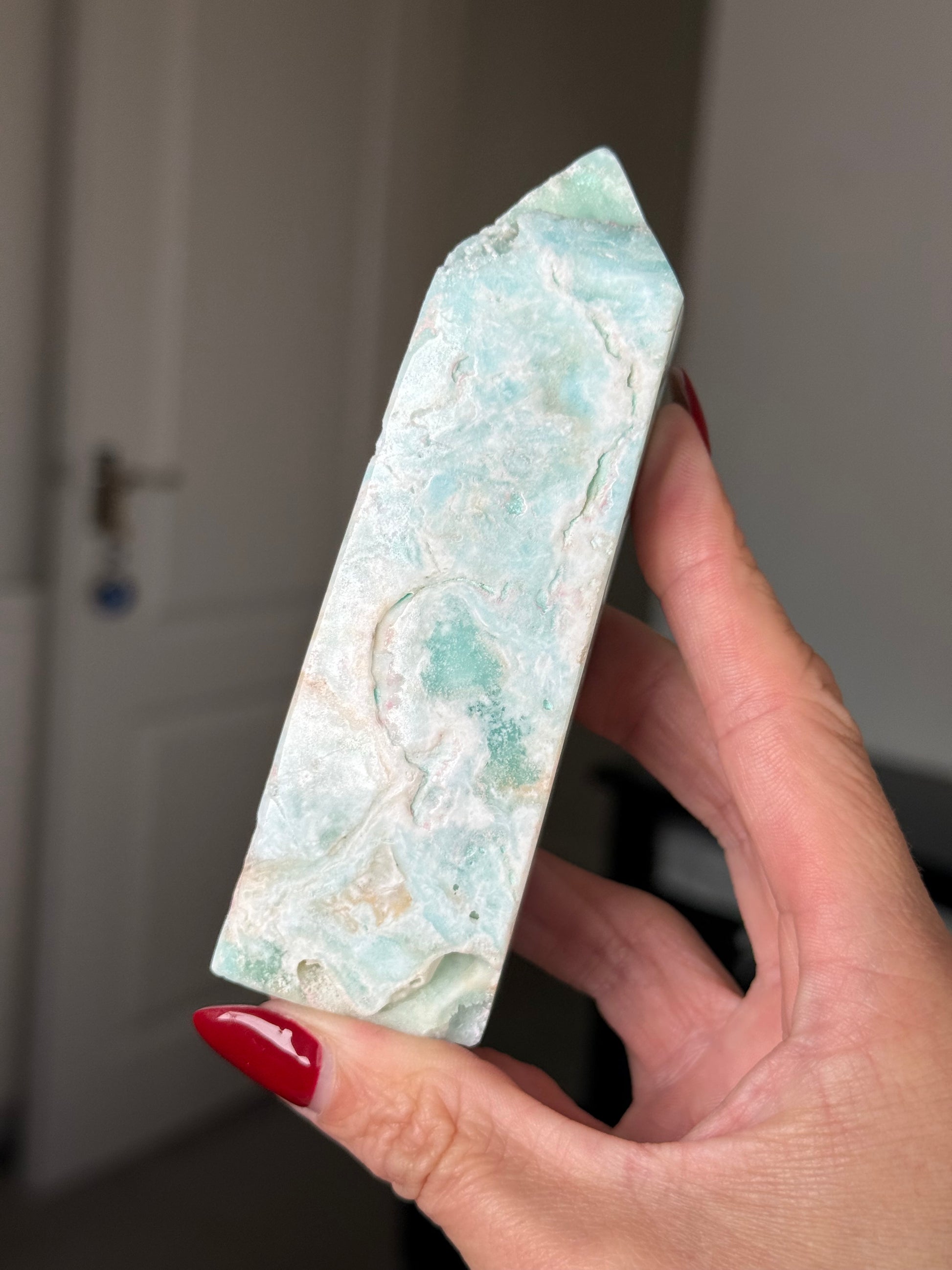 Blue Aragonite is a calming crystal that is said to help balance emotions, encourage open communication, and support spiritual and emotional growth.