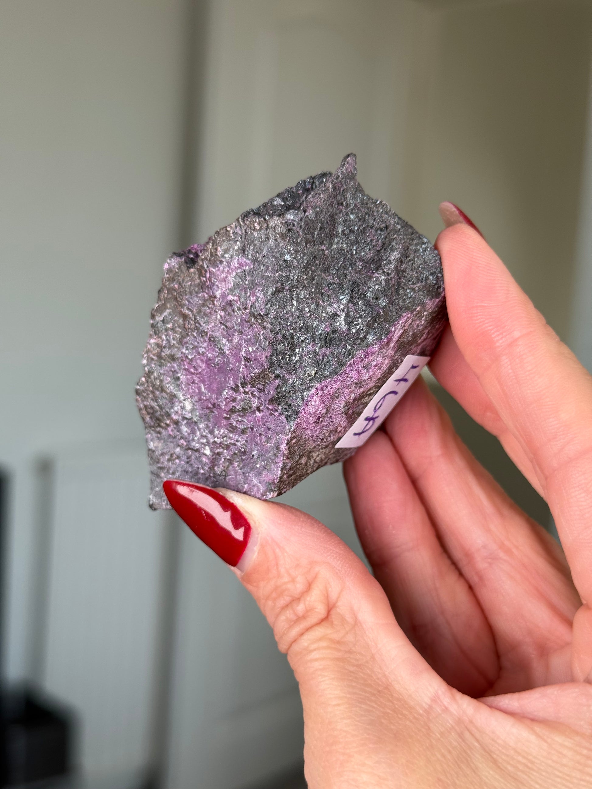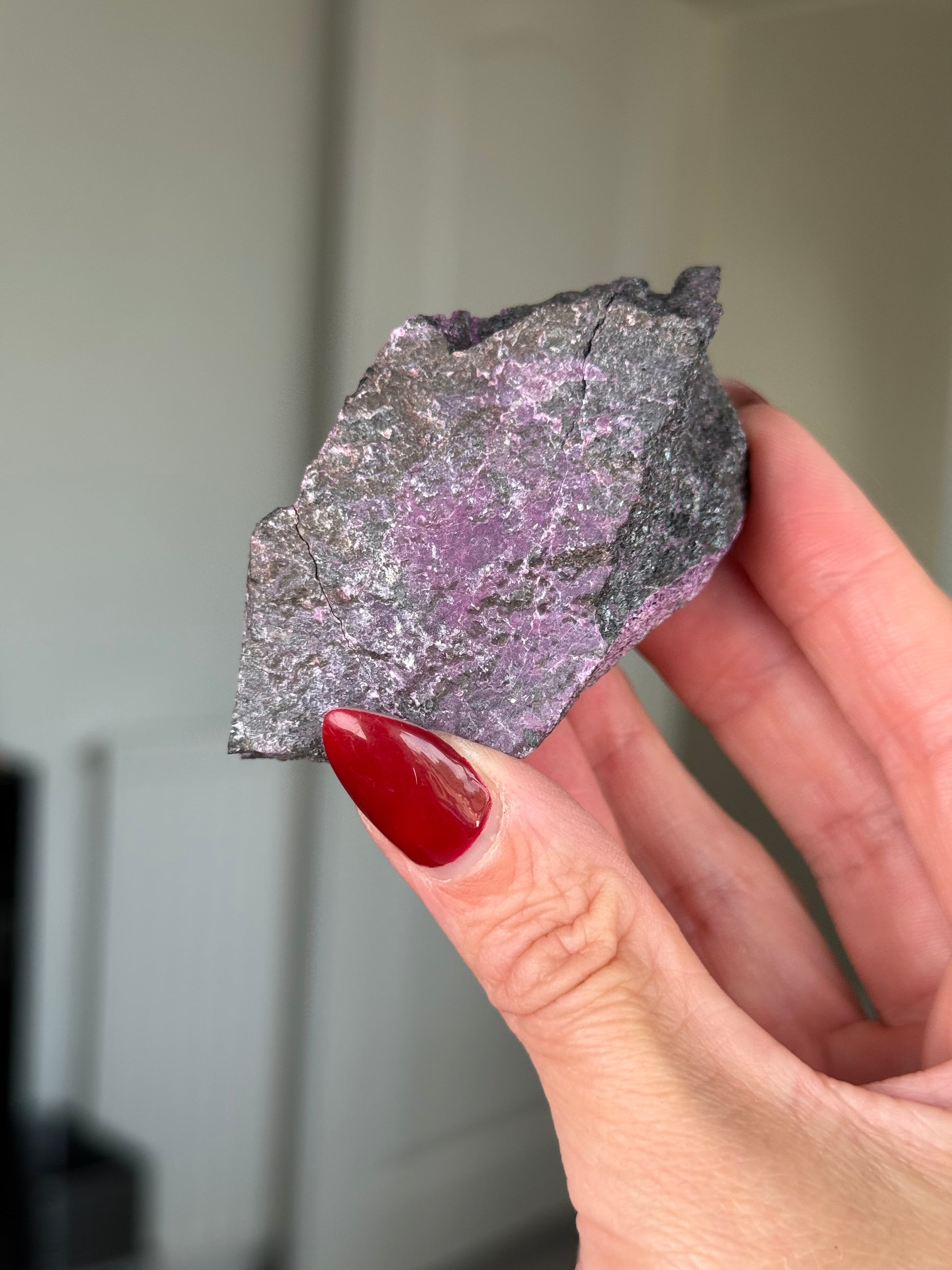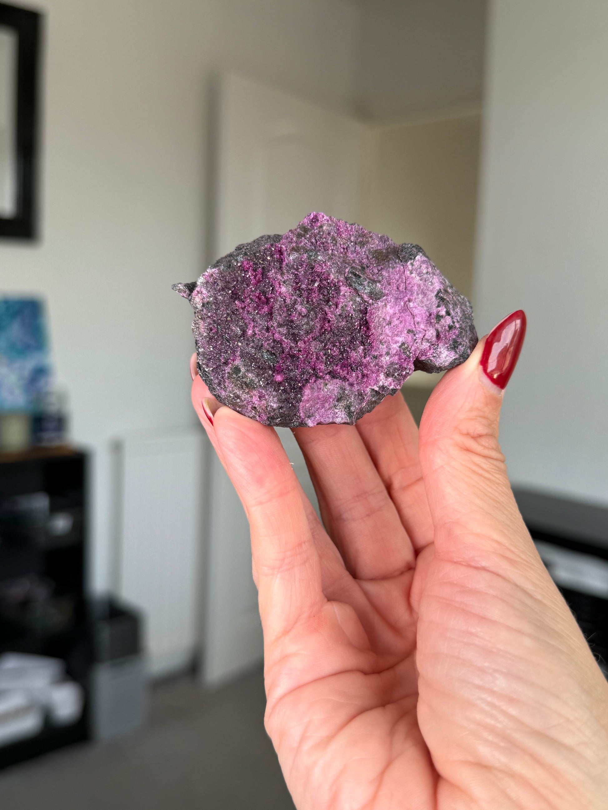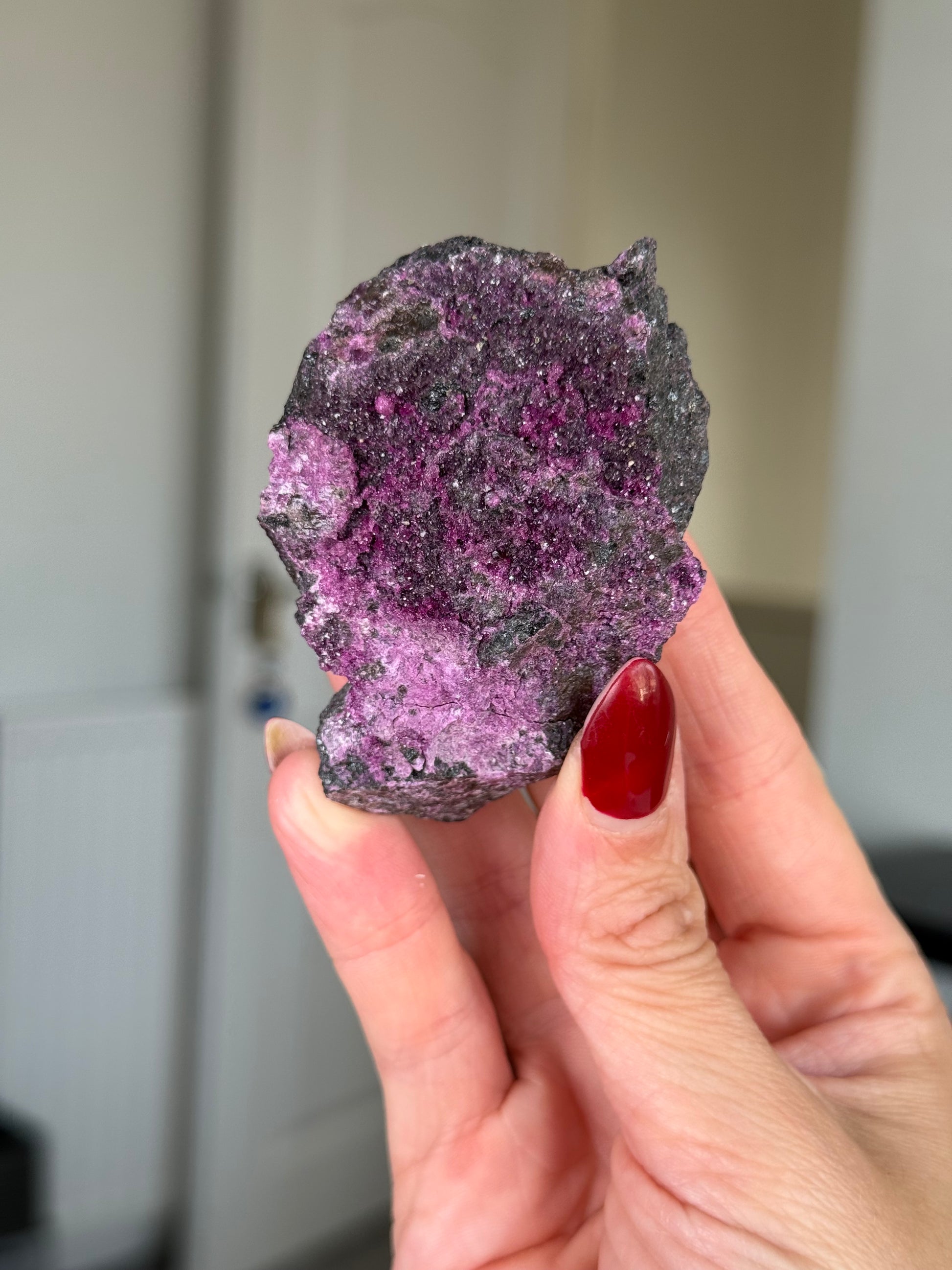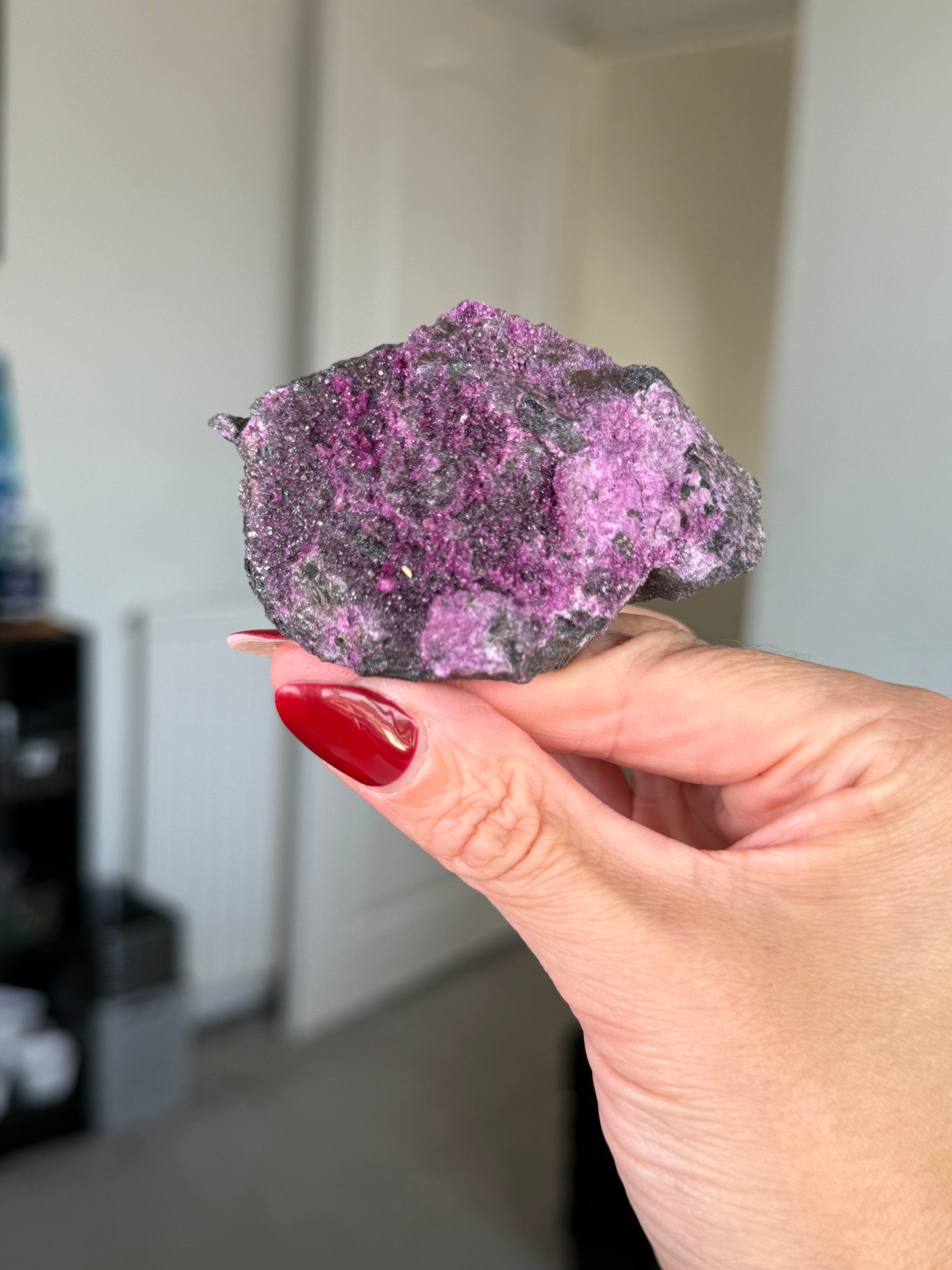 These are very special pieces! Unlike the Kammererite that we usually see from India, this Turkish Kammererite is crystallised and sparkles on the host rock which also happens to be kinda sparkly ✨
