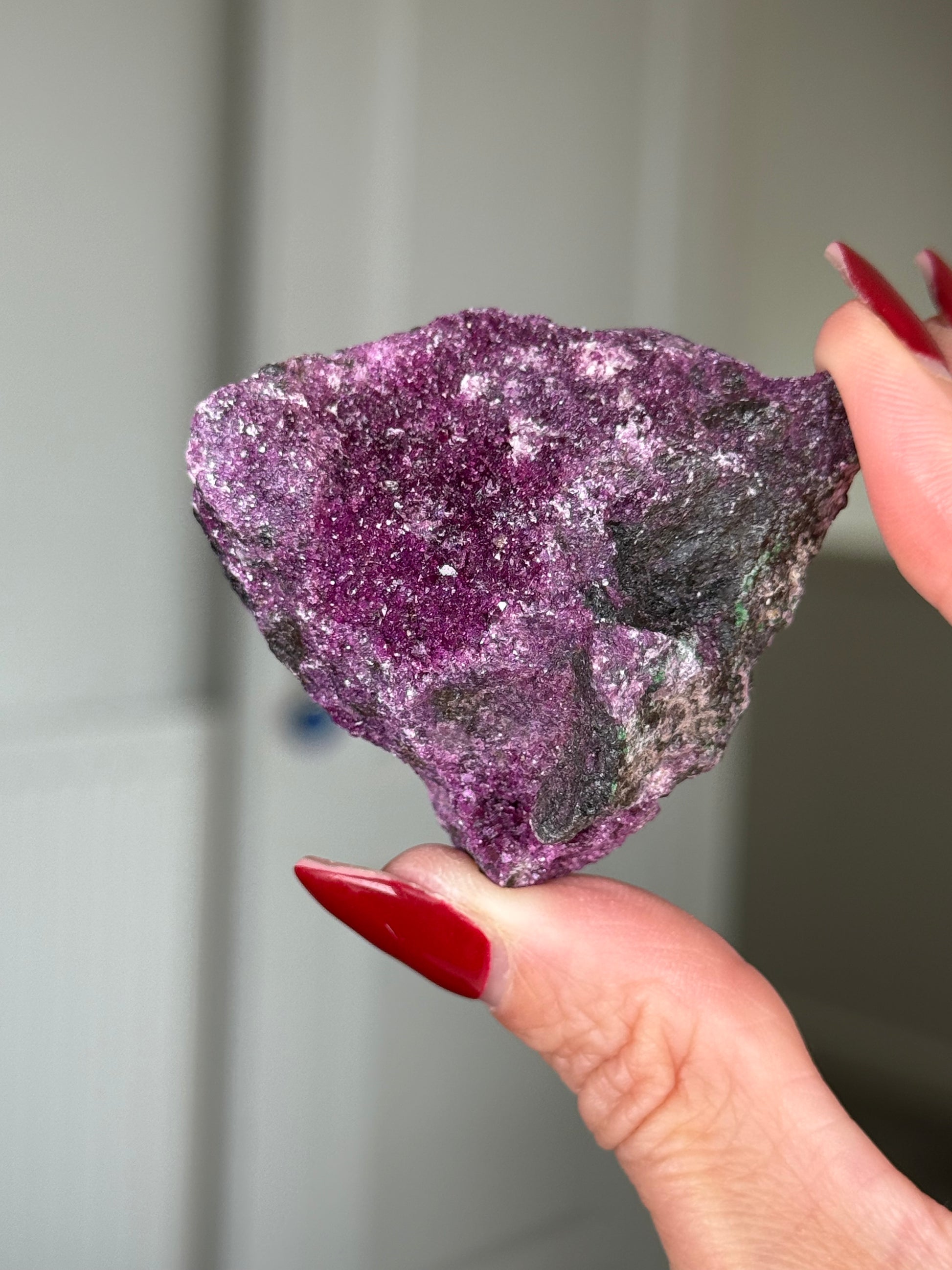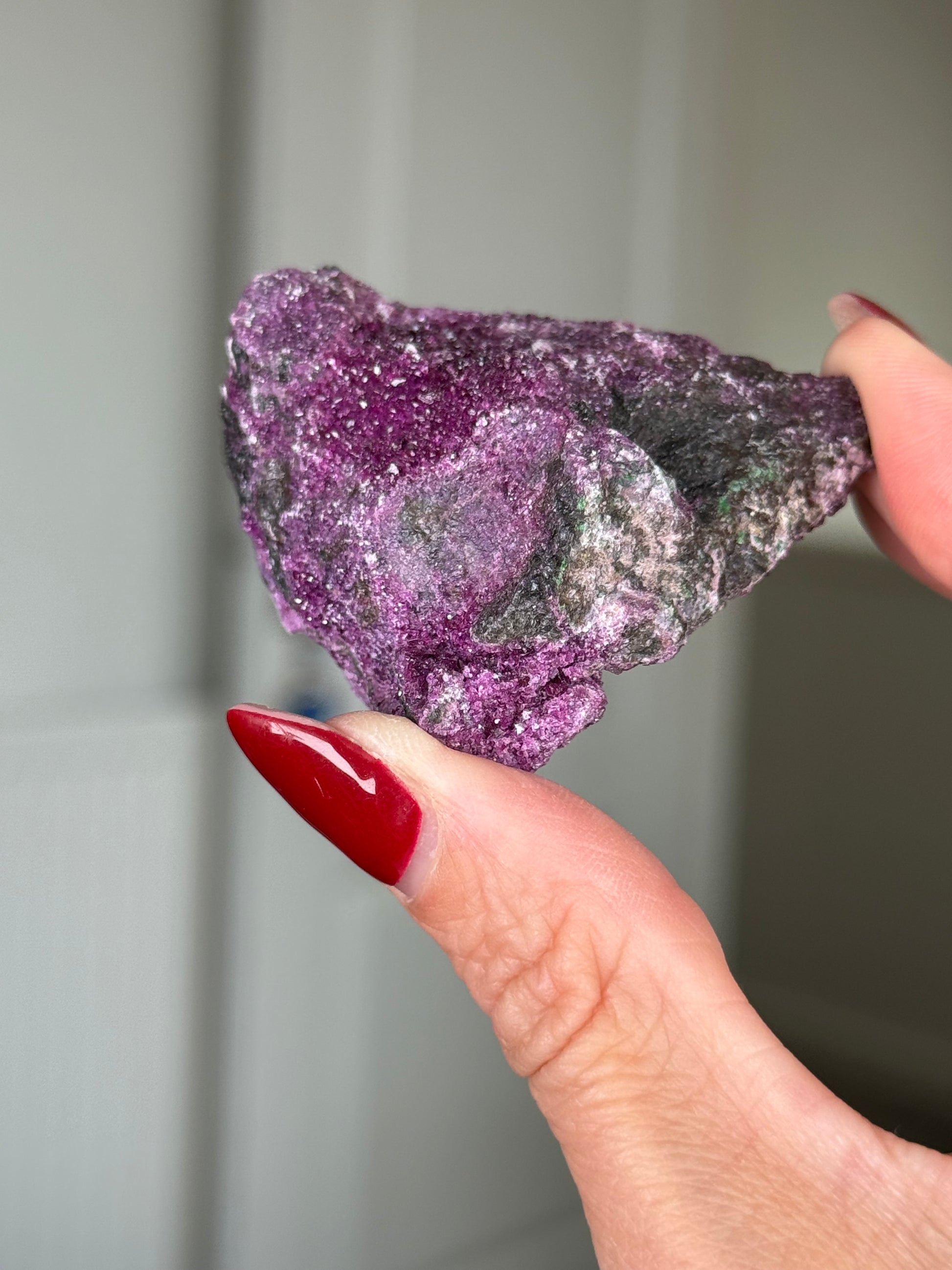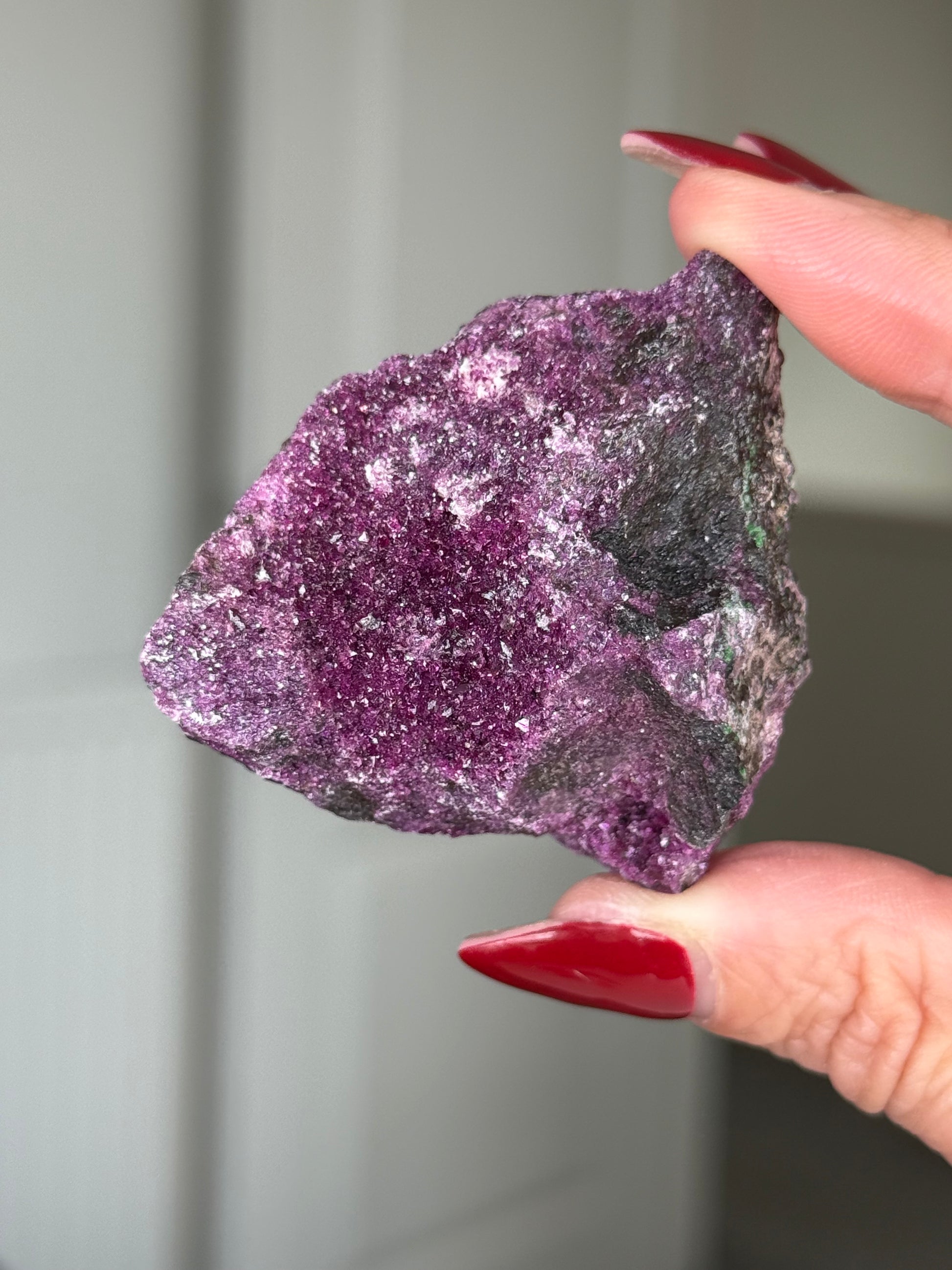 These are very special pieces! Unlike the Kammererite that we usually see from India, this Turkish Kammererite is crystallised and sparkles on the host rock which also happens to be kinda sparkly ✨