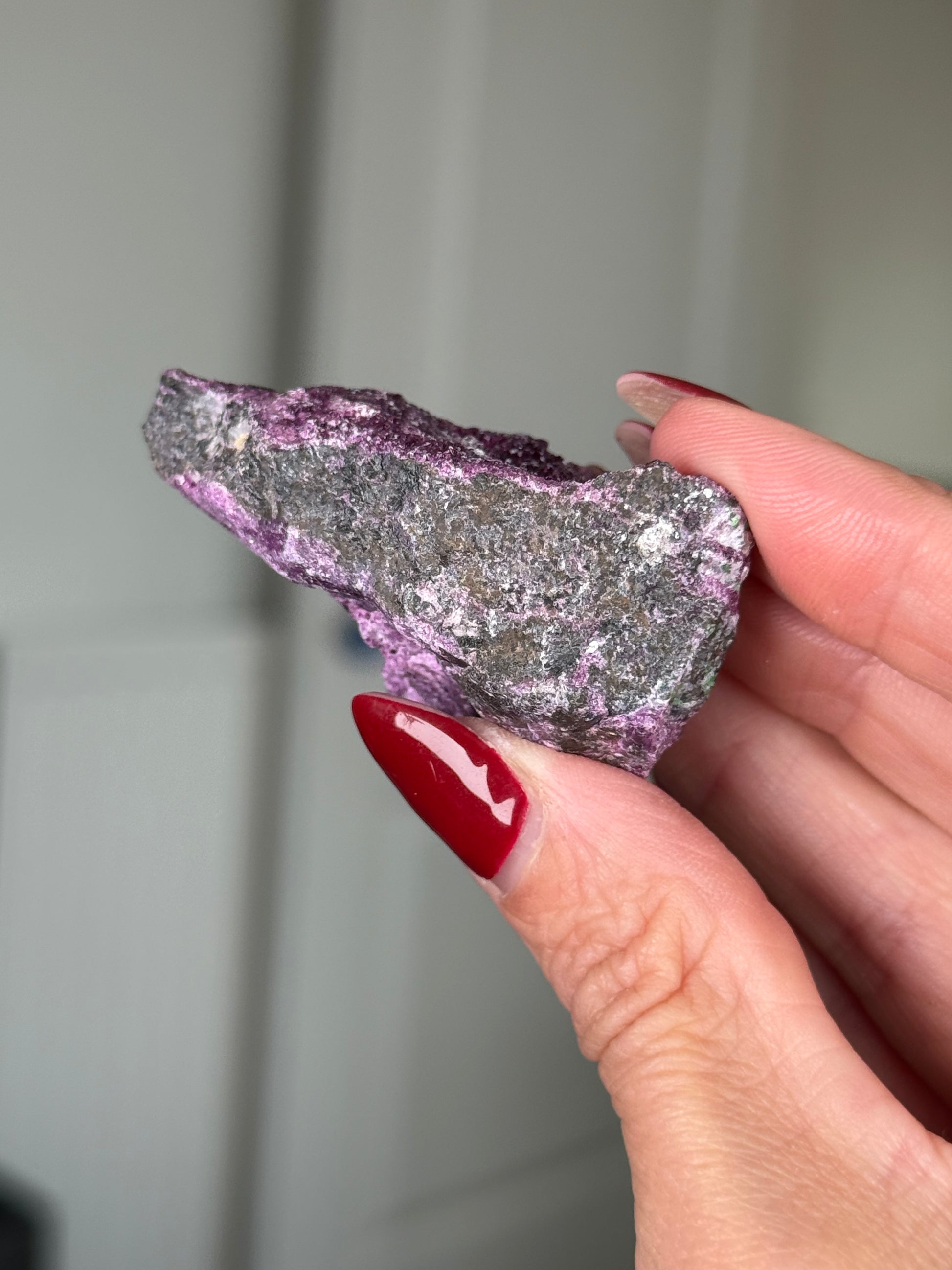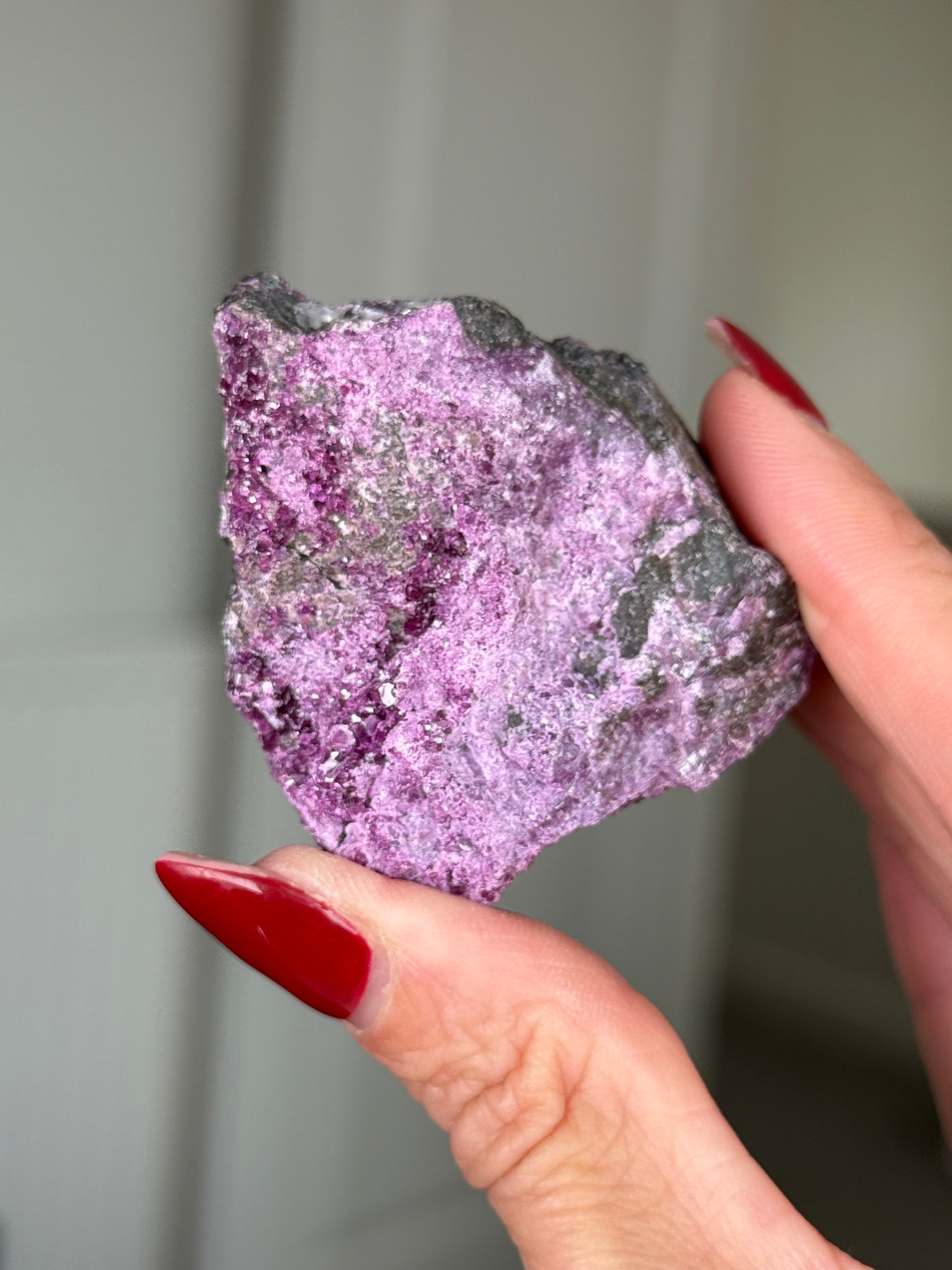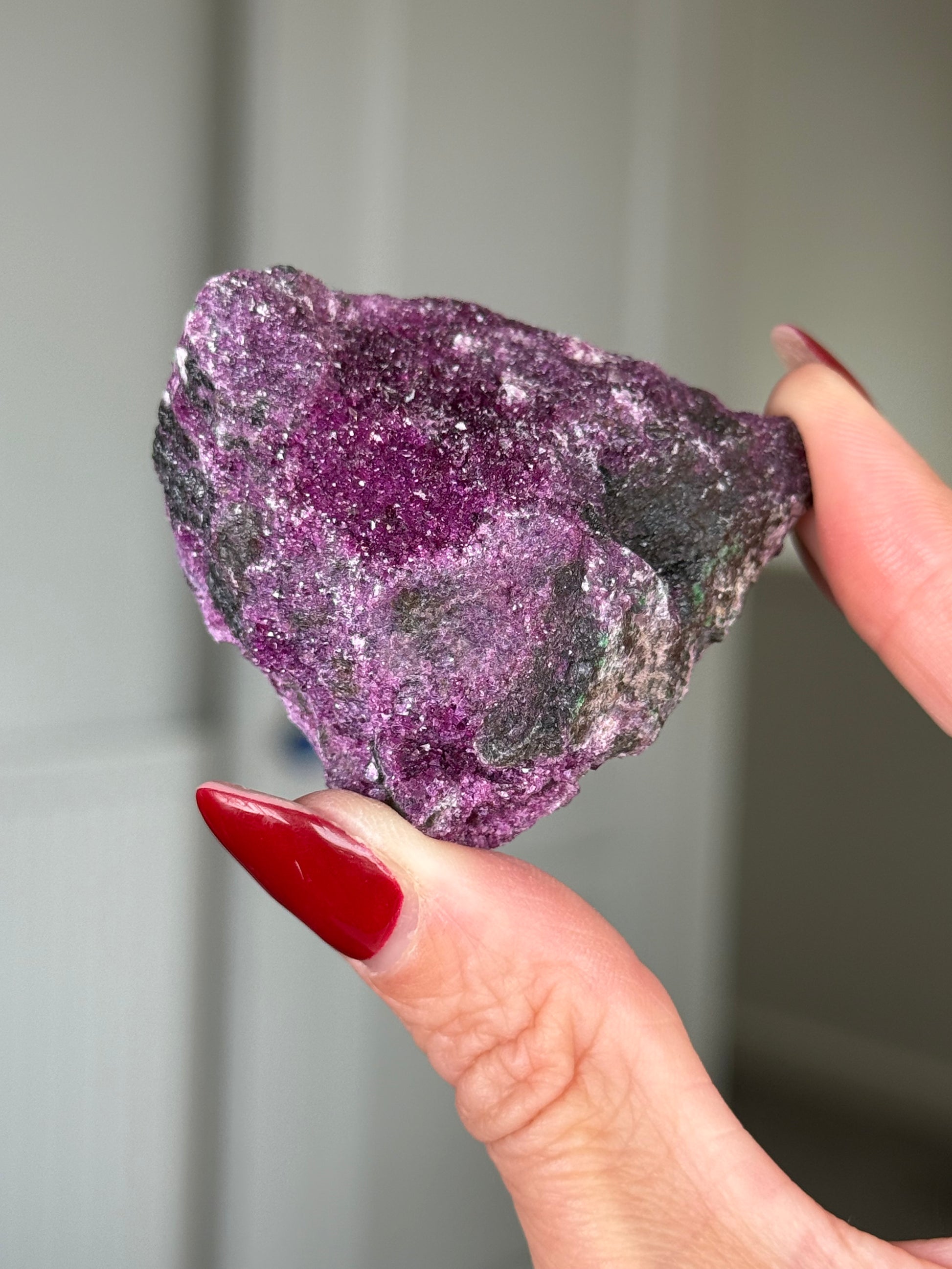 These are very special pieces! Unlike the Kammererite that we usually see from India, this Turkish Kammererite is crystallised and sparkles on the host rock which also happens to be kinda sparkly ✨